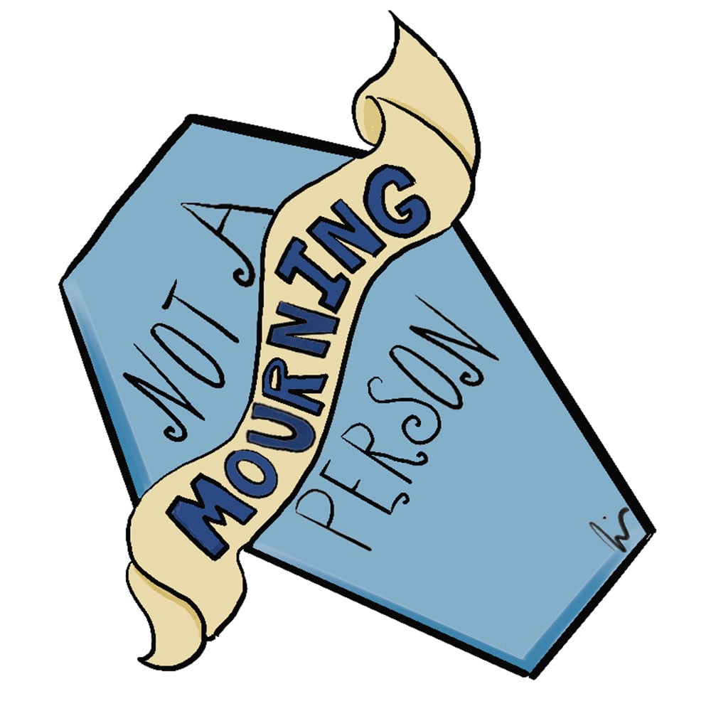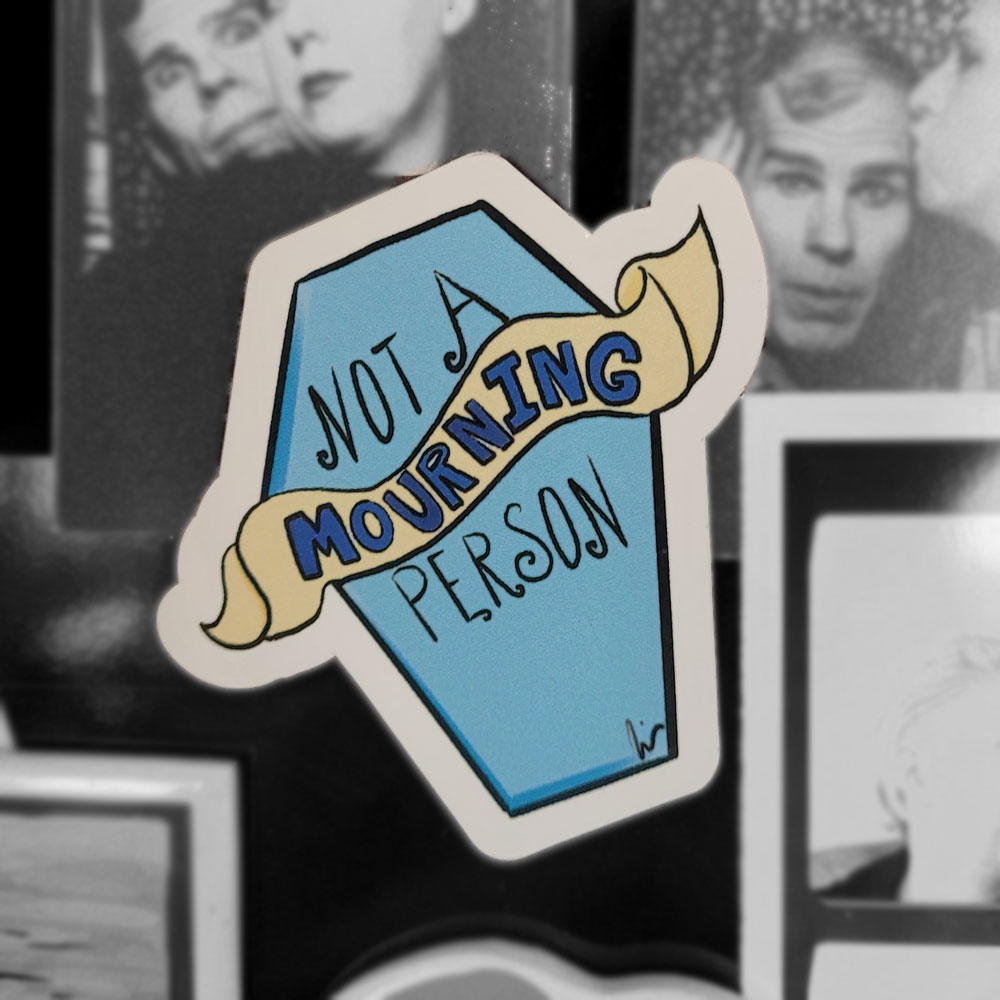 Not A Mourning Person coffin shape die-cut magnet with a gloss laminate measures approximately 2" x 2.25".